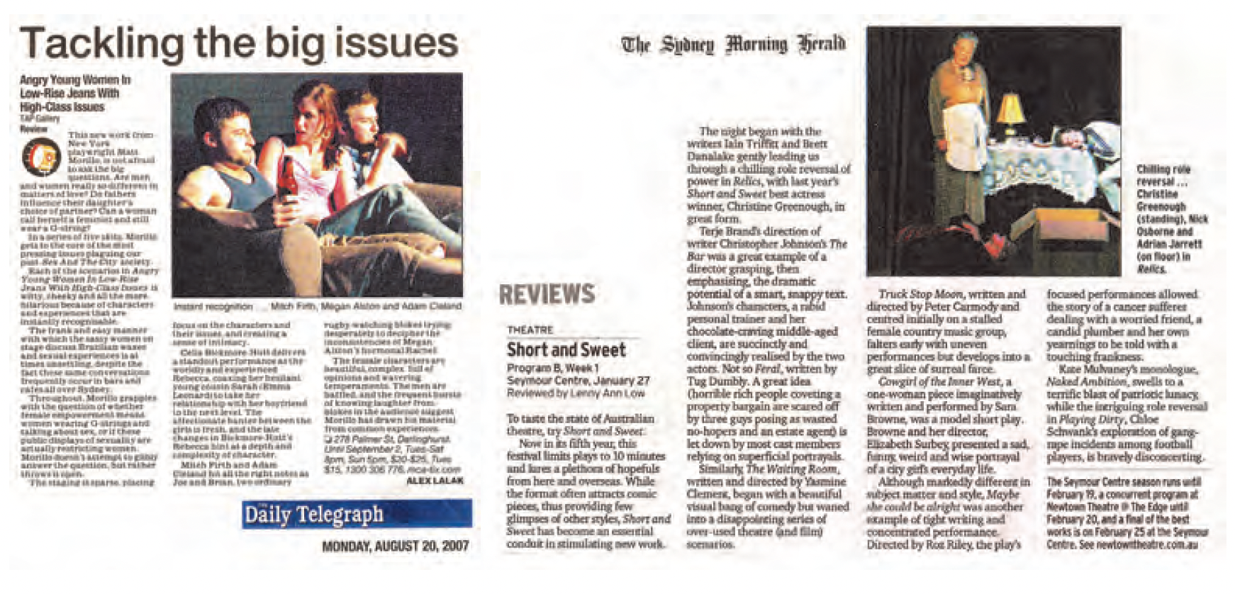 Angry Young Women With High Class Issues in Low Rise Jeans (MX) Short+Sweet (Inner Western Courier) Fast+Fresh Dance (Sydney Morning Herald Metro cover story) Phoenix Theatre Company’s Laramie Project (Northside Courier) Fast+Fresh Dance (WeeklyView cover story) Short+Sweet (The Glebe cover story)